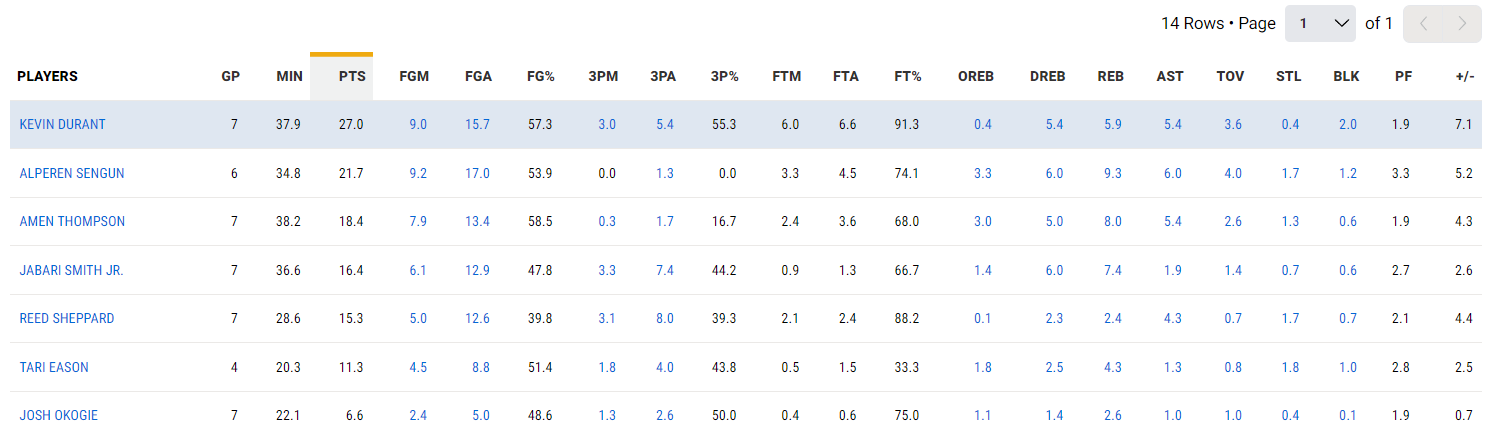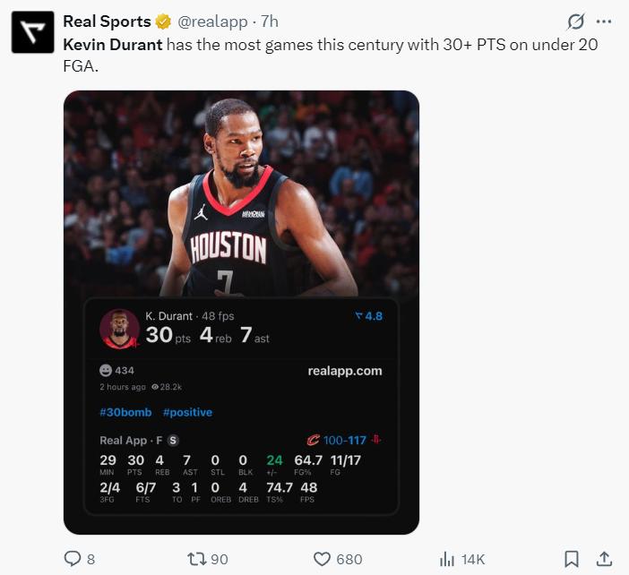 此役杜兰特全场比赛28分钟,17中11,三分4中2,罚球7中6,拿到30分7助攻4篮板,命中率64.7%,三分命中率50%,真实命中率74.7%,正负值+24,在申京缺席的情况下他成为球队的进攻/组织核心。