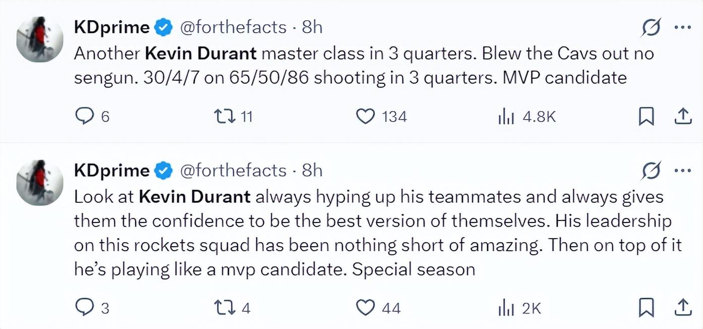 休媒:杜兰特三节打卡拿到30+4+7,三项命中率65/50/86,他再一次打出了MVP的数据。看看凯文-杜兰特,他总是激励队友,让队友们充满信心,展现出最出色的一面。他在火箭队的领导能力堪称一流。不仅如此,他过去三个赛季的表现都堪称 MVP。这个赛季堪称非凡的赛季。